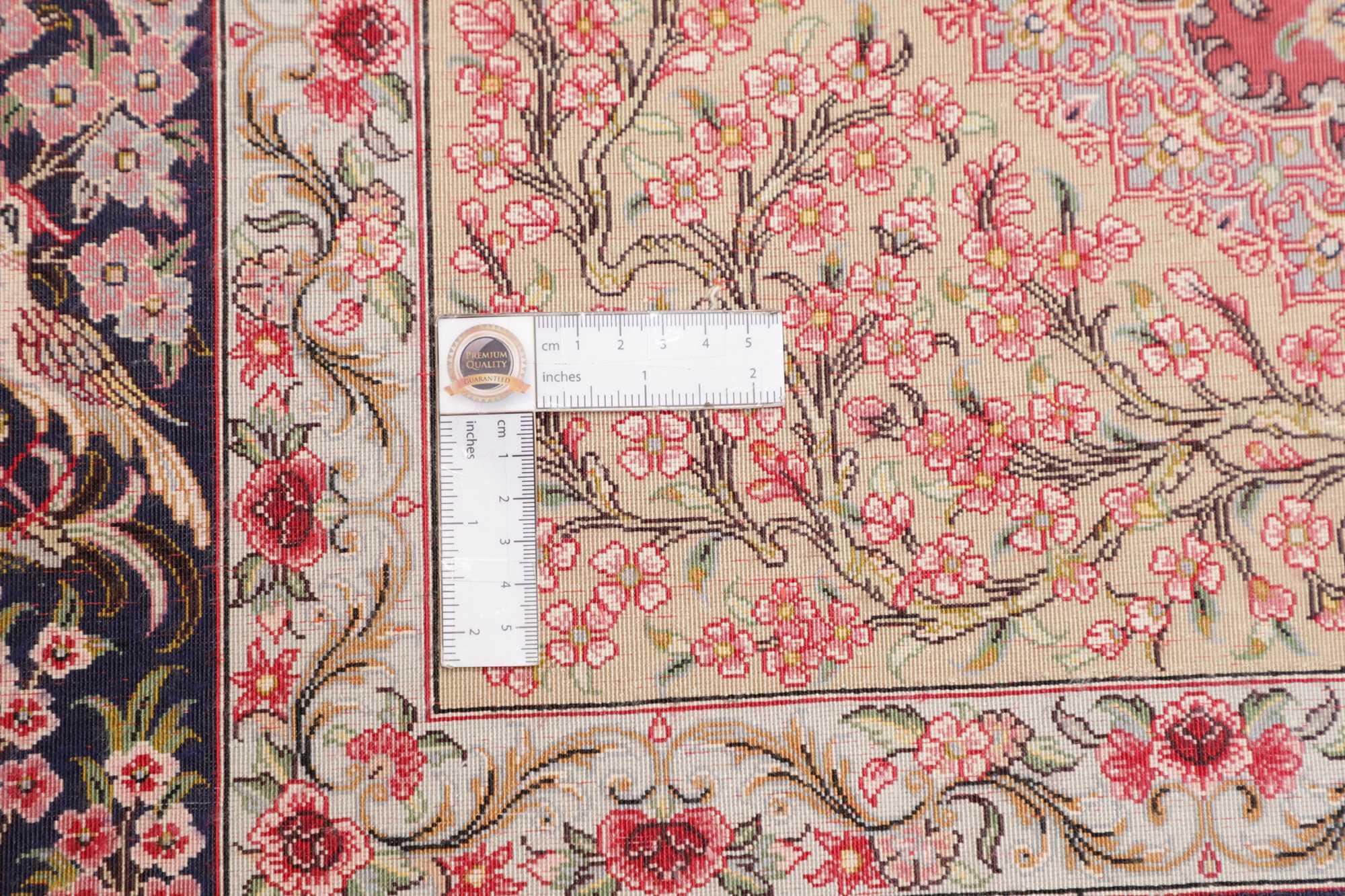Silk chain: The warp is the base fabric on which the pile is knotted. The finer the warp, the sharper the pattern of the rug at the end. Only the finest rugs are knotted on silk, because with silk you can create a much tighter and finer warp than with wool. Therefore, only with real silk in the warp can you achieve knot counts of 600,000 and more knots per QM.